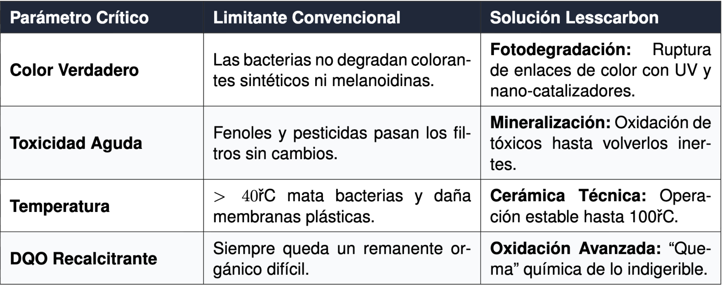 Los sistemas de tratamiento secundario (biológicos o físicos-quimicos) ya no son suficientes. Con las entrada en vigor de la nueva normativa, los parámetros de descarga se han endurecido drásticamente, poniendo en riesgo a industrias con efluentes complejos.
